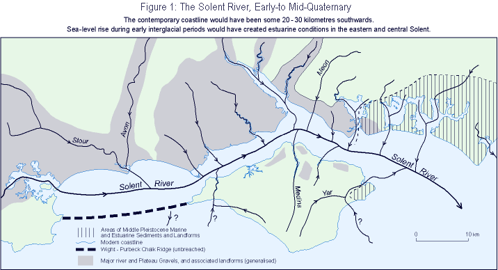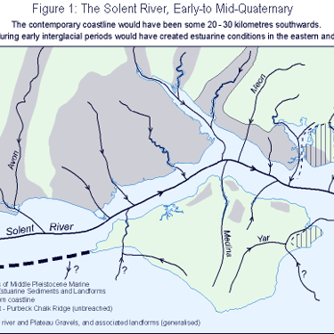 “Buried valley of the Solent estuarine system” — shows the subsurface valley structure (gravel bases etc.) that underlie the modern seabed under what is now the Solent and Southampton Water.